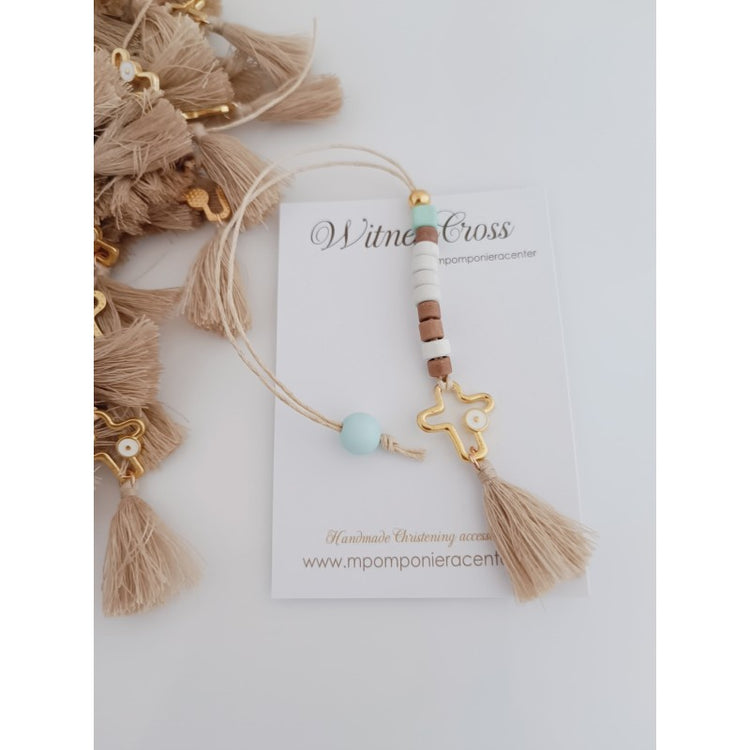 Μαρτυρικό μπεγλέρι σε αποχρώσεις λευκό-μπεζ-βεραμάν με ιδιαίτερο σταυρό και φουντίτσα