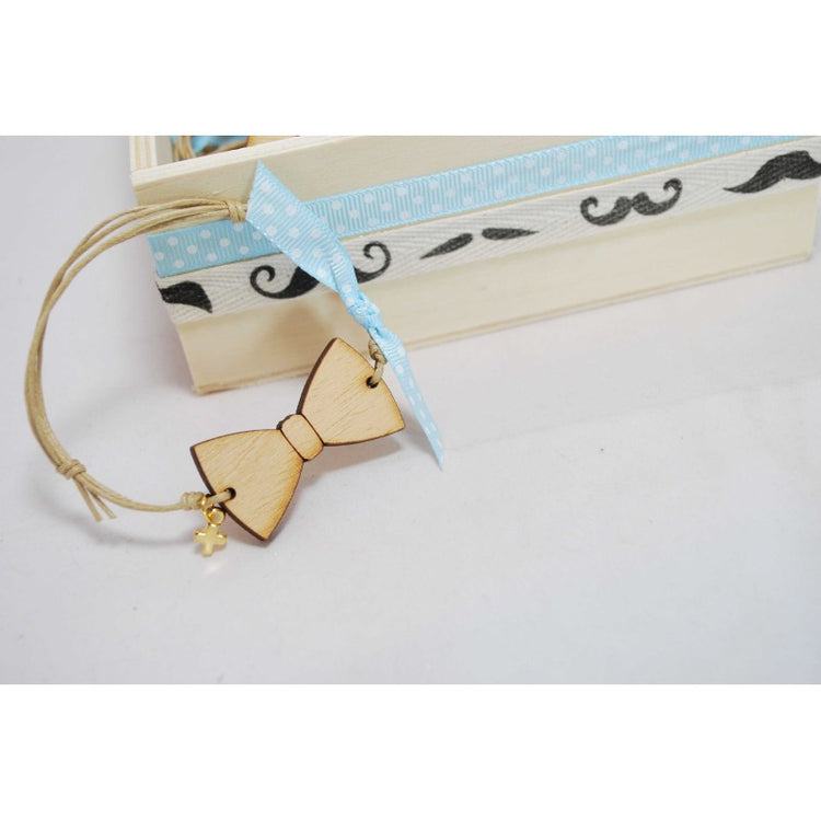 Μαρτυρικό παπιγιόν βραχιόλι ξύλινο , καφέ κορδόνι και διακοσμητική γαλάζια κορδέλα