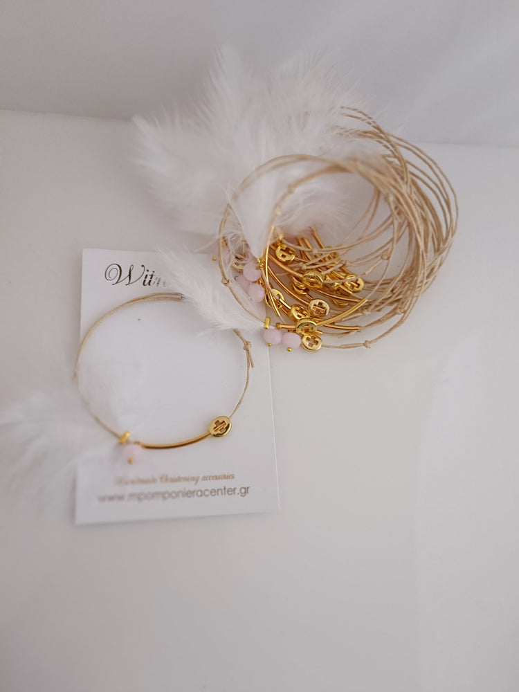 Μαρτυρικό βραχιόλι με ιδιαίτερο σταυρό , πούπουλο, κρεμαστή μπίλια ροζ,  περαστό σταυρό σε χρυσό