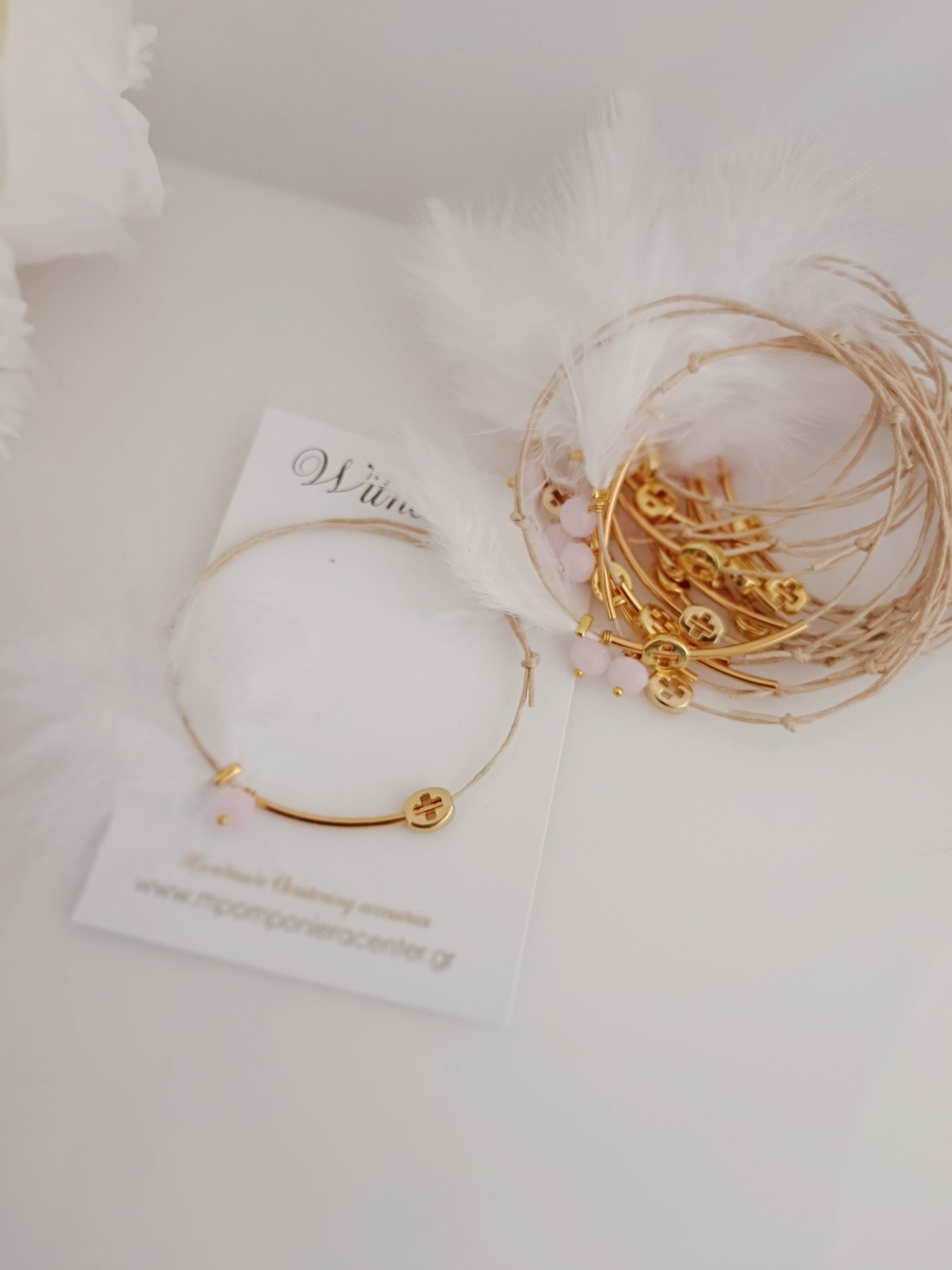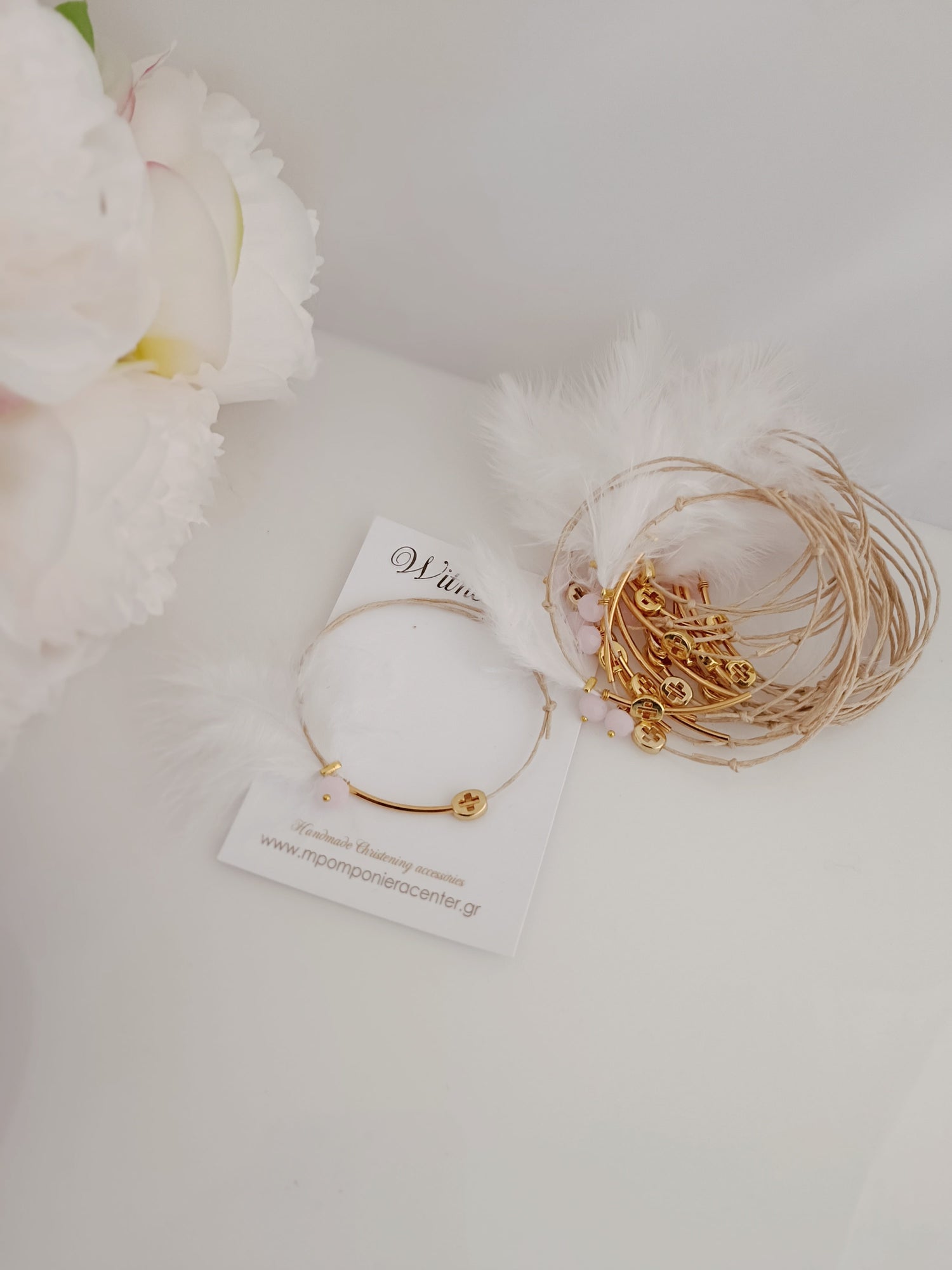 Μαρτυρικό βραχιόλι με ιδιαίτερο σταυρό , πούπουλο, κρεμαστή μπίλια ροζ, περαστό σταυρό σε χρυσό