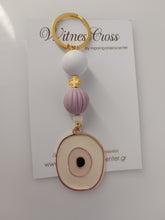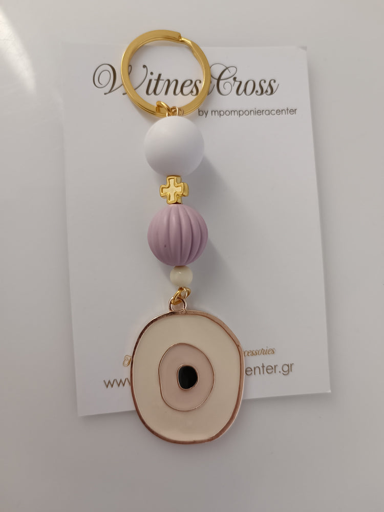 Μαρτυρικό μπρελόκ με μάτι & ιδιαίτερο σταυρό εσωτερικά του μπρελόκ - λιλά & λευκό